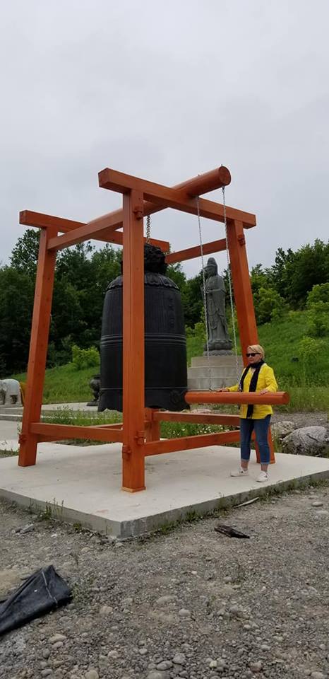 Ringing the gong at the Buddhist temple in Bethany, Ontario.